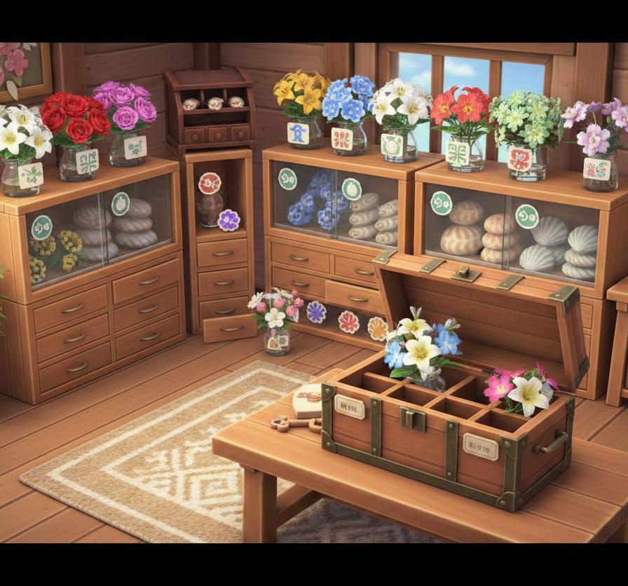 また、取り出しやすさを重視するなら、同じ種類のアイテムはすべて一つの場所に固めておくべきです。例えば、オレンジのバラを10本持っているなら、端数でバラバラにするのではなく、必ずスタック(重ねる)機能を活用して一つの枠に収めるようにします。こうすることで、収納枠の節約になるだけでなく、視認性が向上し、在庫過多に陥るのを防ぐことができます。整理整頓の習慣が身につけば、島の生活はよりシステマチックで快適なものへと進化していきます。