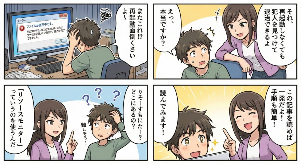 再起動を試しても消去できない場合は、特定のプログラムがWindowsの起動と同時に再びデータを掴んでいることが予想されます。その場合は、システム全体の再起動ではなく、特定の犯人を特定して狙い撃ちにする手法へと切り替えていく必要があるでしょう。次のステップでは、手動で特定のプロセスを停止させるための強力なツールを活用します。