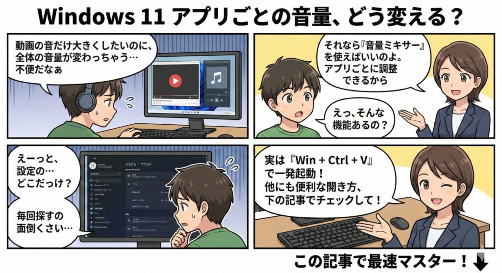 | Win + Ctrl + V | 音量ミキサーを直接表示 | 素早いアプリ別音量調整 |